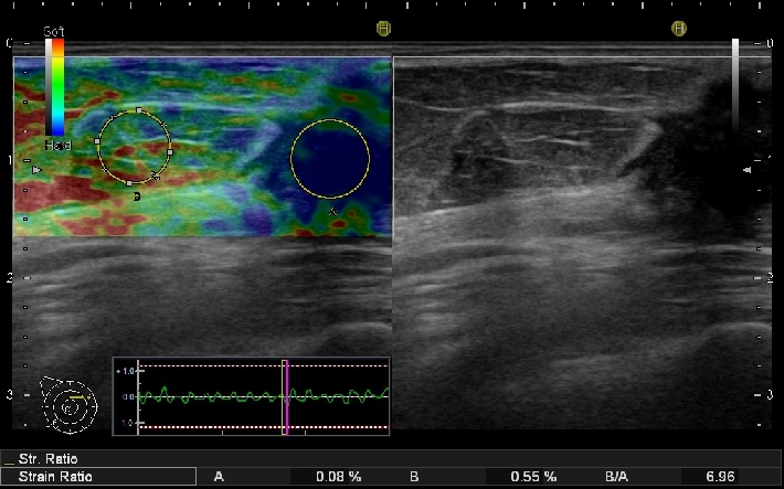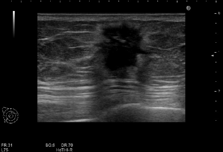 乳腺内の腫瘤や、乳腺構造の変化などを観察します。腋窩のリンパ節もチェックします。乳腺検査は女性技師が担当します。