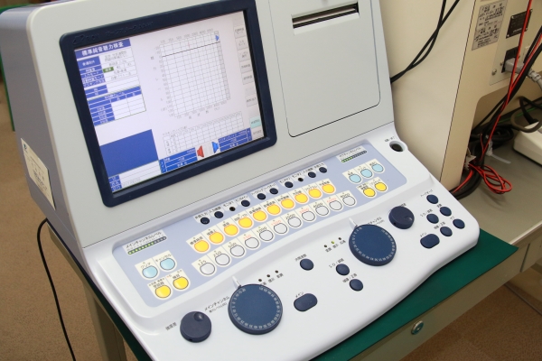 難聴やめまいの際に、聞こえを調べます。125Hz(低音)~8000Hz(高音)まで周波数別に検査します。骨の振動で聞こえる骨導聴力も調べます。