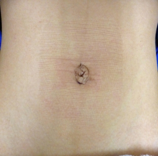 腹腔鏡で手術を行うにはカメラ用、術者右手用、左手用の少なくとも3つの筒が必要です。従来であれば3か所の傷ができるところを、ひとつの傷でできないかと開発されたのが単孔式腹腔鏡手術です。単孔式手術はおへそだけに皮膚切開(2-3cm)を加え、そこから3つの筒を差し込んで行います(図4)。この手術は技術的難易度が上がるため、当院では胆嚢と虫垂の手術を対象としています。施設によっては胃癌、大腸癌まで対象疾患を広げているところもあります。写真は単孔式虫垂切除術の術後1週間目の傷の写真です(図5)。遠目にはどこが傷かわかりません。単孔式の利点は何と言ってもその整容性にあるといえます。このように、腹腔鏡手術も日々進化しています。