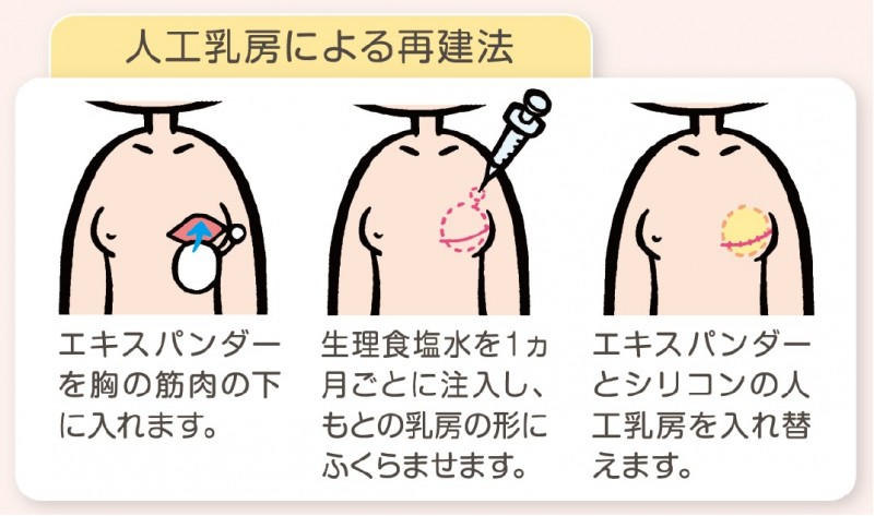 再建方法はまずエキスパンダーという皮膚を伸ばす袋を胸の筋肉の下に入れ、その袋に生理食塩水を徐々に注入し皮膚を伸展させたのち、最終的にインプラントに入れ替える方法がとられます。