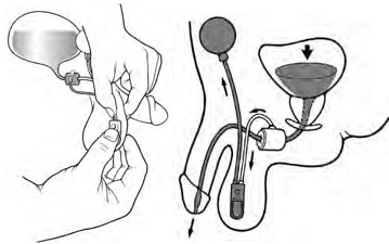 腹部に埋め込んだリザーバーバルーン内の液体と尿道に巻きつけられたカフ内の圧が一定になることにより尿道を圧迫し、尿が漏れないように保ちます。排尿時には陰嚢内に留置したコントロールポンプを自分で圧迫することにより、尿道周囲のカフ内の液体を一時的に腹部のリザーバーバルーン内に送り込みます(下図左)。その結果、尿道の圧迫が解除され排尿が可能となります(下図右)。排尿後はリザーバーバルーンから数分間かけて徐々に液体がカフに戻り、尿道を圧迫して尿を漏らさない状態にします。