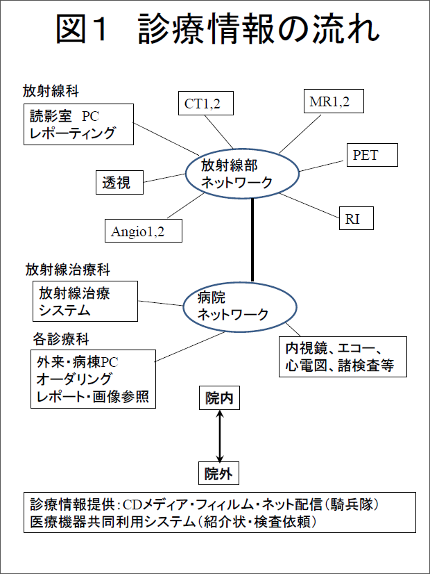 院内:病院オーダリングシステムとともに、放射線検査データのデジタル保管及び、PC端末を利用したレポーティングシステムが稼働しており、2014(H26)年度よりフィルムレス運用が開始され、従来のフィルムの代わりに、各診療科外来・病棟のPC端末で画像デジタルデータおよびレポート参照が可能となっています。