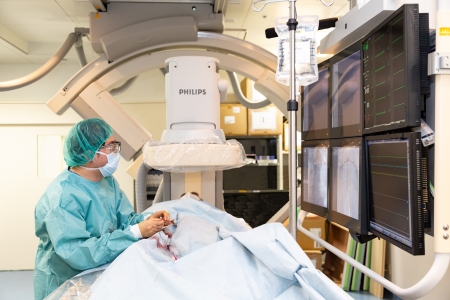 X線透視やCTの画像をみながらカテーテルを目的部位まで挿入して、様々な低侵襲治療(IVR;画像下治療)を行っています。産科出血や喀血、消化管出血、外傷や術後出血に対して出血部位までカテーテルを進めて血管を塞栓し止血したり、進行癌に対して栄養動脈にカテーテルを挿入して抗がん剤を注入する治療を行うこともあります。内臓動脈瘤や肺動静脈奇形に対するコイル塞栓術、門脈圧亢進症による消化管静脈瘤に対するバルーン閉塞下の塞栓術(BRTO)、CTガイド下生検やドレナージなども多数施行しています。当院では日本IVR学会専門医の資格を有する放射線科医が各診療科からの依頼をうけて施行しています。