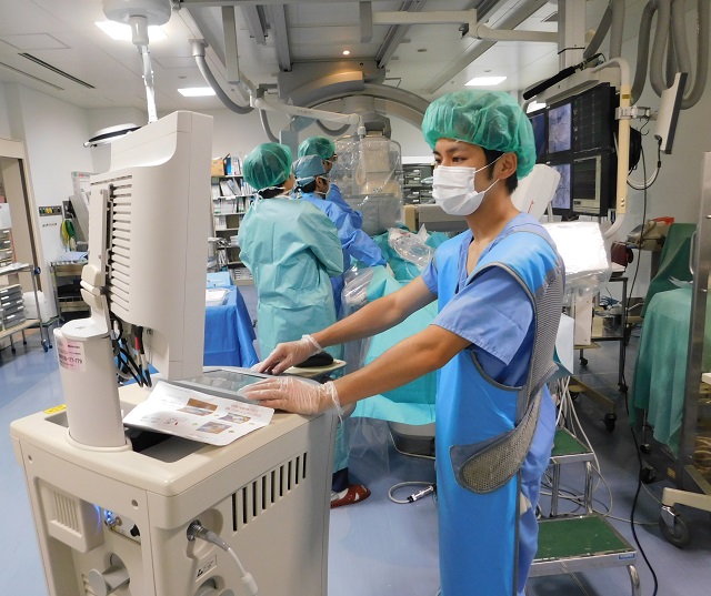 (写真左)冠動脈インターベーション中にIVUSを操作しています。