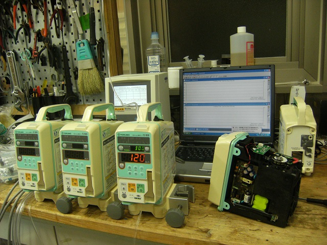 (写真下)輸液ポンプ等の機器は定期的にメンテナンスをしています。