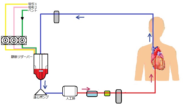 心臓手術では、大静脈から血液を人工心肺装置へと誘導し、人工肺で酸素を与え、大動脈から全身へと返します。人工心肺により、全身の酸素を確保している間に、自分の心臓と肺を血液が通過する事なく全身の血液循環を保つことで、心臓を止めて心臓内の修復を行うことが可能になります。