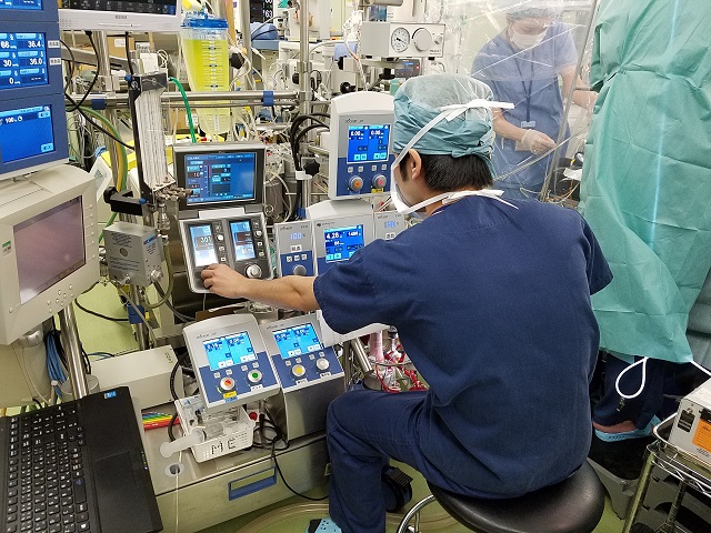 (写真)人工心肺+心筋保護を操作している工学技士です。