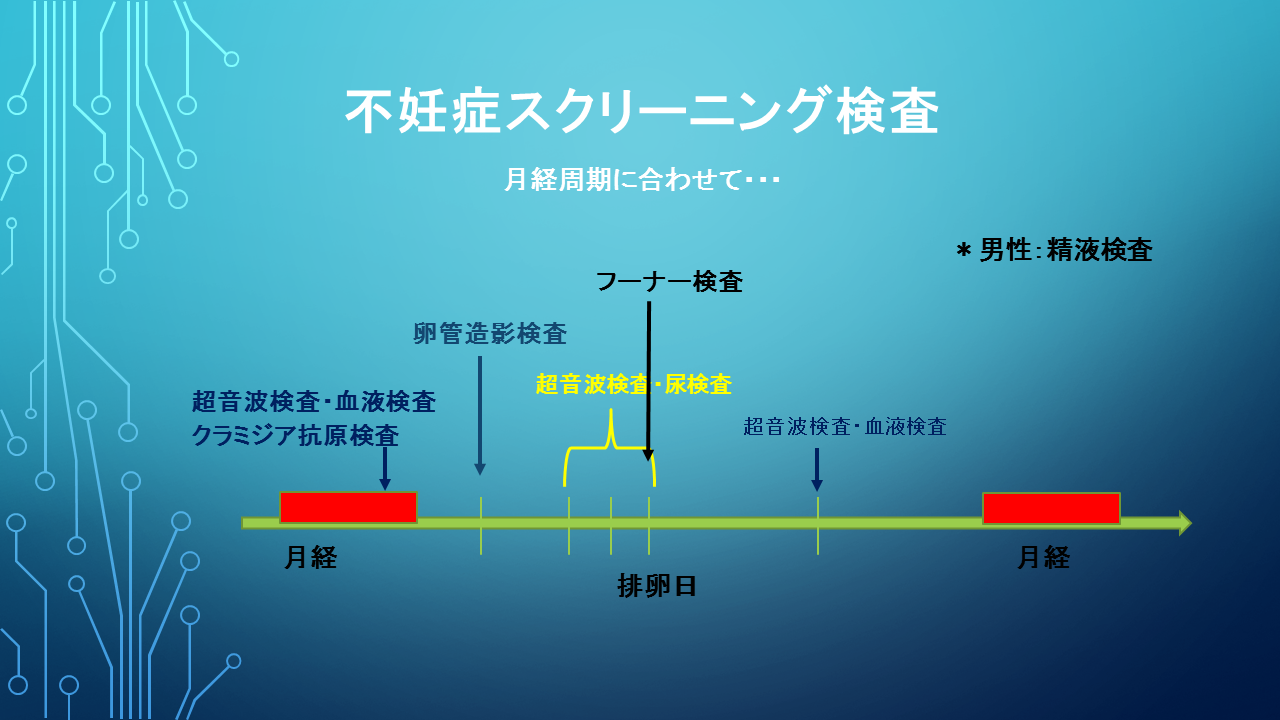 その過程のどこかがうまくいかなければ、妊娠できないので、月経周期に合わせてその過程について検査していくのが不妊症スクリーニング検査です。