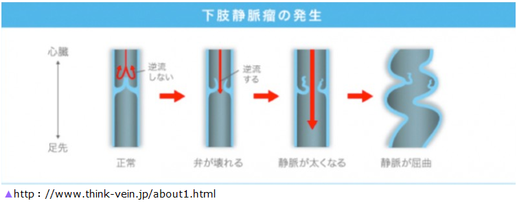 この静脈弁が何らかの原因で破壊されて血液が逆流すると表在静脈(皮膚に近い静脈)が蛇のように曲がり『下肢静脈瘤』という状態になります。