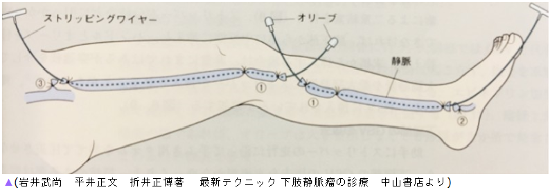 従来の治療法で現在でも行われています。弁が壊れた表在静脈をストリッパーという器具を用い抜去します。下記の血管内治療に比べ高侵襲(ダメージ大きい)です。