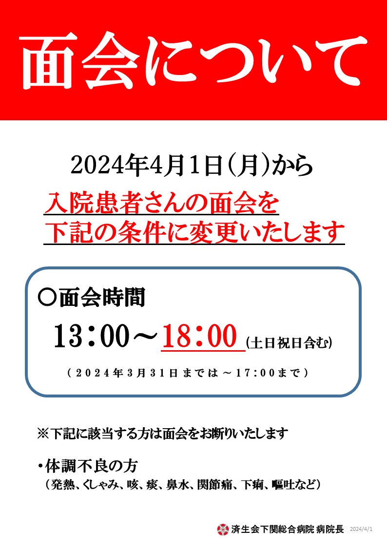 ※上記の面会時間以外は、入院・退院・手術など、緊急の場合のみとさせていただきます。その他の場合はお断りする場合