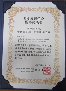 2012年看護管理、2015年看護教育、2019年急性期看護において、日本看護学会優秀発表賞を受賞しました。