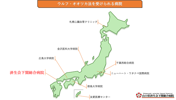 ウルフ・オオツカ法は、心房細動が原因による脳梗塞を予防する治療法のひとつです。脳梗塞の原因となる血栓のほとんどは心臓の左心耳という部位で生成されるため、その左心耳を低侵襲で切除し、さらに不整脈も併せて止めるための手技も追加で行う手術です。下関の医療圏だけでなく、中国地方や九州からの患者さんも多く受け入れております。