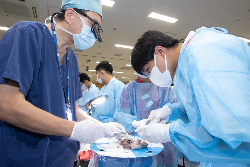 午後からは、心臓モデルなどを用いた模擬手術、内視鏡手術、胃カメラなどを現役の医師から解説、指導を受けながら体験。真剣な表情で取り組む高校生たちの姿に、将来への熱意が感じられました。