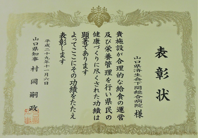 この賞は、長年にわたり給食における栄養管理の運営が優秀であり、他の施設の模範となる取り組みをしている「特定給食施設」に対して山口県知事が表彰を行なうものとなっています。