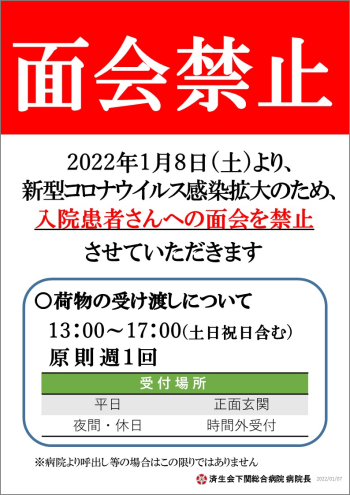 当院では、院内感染症対策の一環として、2022年1月8日(土)より入院患者さんへの面会は禁止させていただきます。