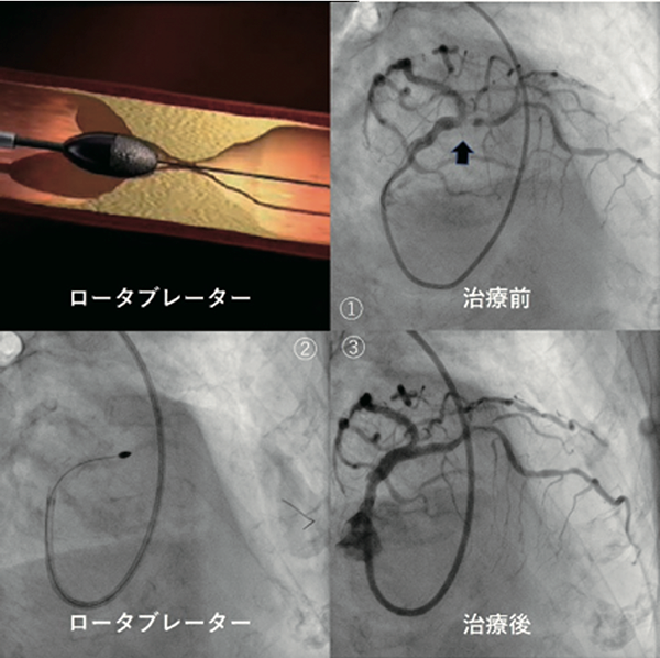経皮的冠動脈インターベンション(PCI)とは、冠動脈の狭窄・閉塞病変に対してカテーテルを用いて治療する方法です。通常はバルーンによる拡張およびステント留置を行うことが一般的ですが、冠動脈複雑病変(石灰化病変、分岐部病変、慢性完全閉塞病変など)に対してはその他のデバイスや特殊なテクニックを用いることがあります。石灰化病変の中には、石灰化のためバルーンで十分な拡張ができない場合があります。またバルーンが通過することすらできないこともあります。そういった場合はロータブレーターというデバイスを使用し、石灰化病変を削る必要があります。その結果、バルーンによる拡張およびステント留置を行えるようになります。