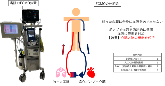 当院では、主に心筋梗塞・難治性の心不全が原因でショック状態や人工心肺術後の離脱困難時、心臓バイパス術や経皮的大動脈弁置換術などの心臓手術中の一過性のショック対応に使用しており、2023年2月から10月までの症例数が15症例を超えました。